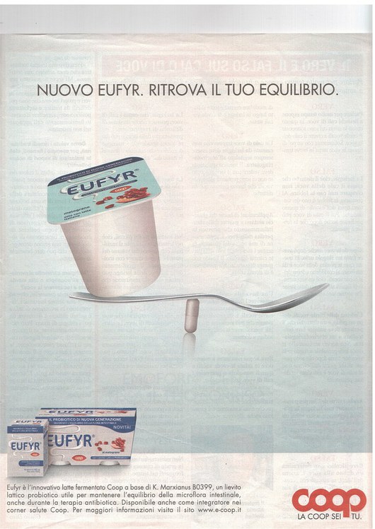 The Coop brand-named “new generation of yogurt” is an innovative dietary product based on the active ingredient TURVAL B0399, which is the first Italian probiotic consisting of lactic yeast and bifidobacteria or lactic ferments, patented by Alessandro Turello’s company—the scientific and technological park of Udine, Turval Laboratories srl. Coop’s EUFYR, unlike other products on the market, is the first yogurt to maintain the equilibrium on the intestinal bacterial flora even during antibiotic therapy.