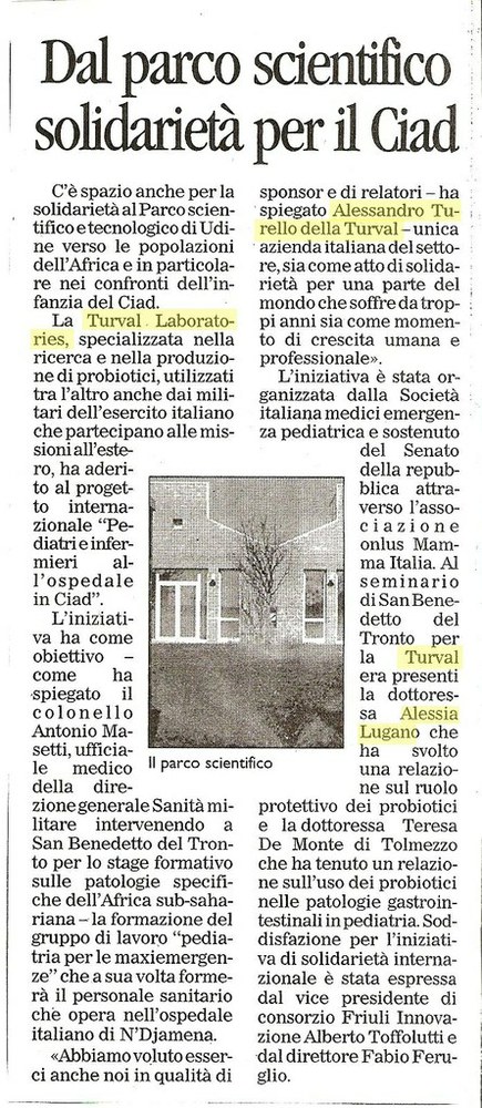 Scientific solidarity for ChadThe initiative was organized by the Italian Pediatric Emergency Doctors Association and sustained by the Senate of the Republic through the association ONLUS (non profit Italian social organization). Mamma Italia. At the seminar of San Benedetto del Tronto, Turval laboratories was represented by Dr. Alessia Lugano, who talked about the protective role of probiotics, and Dr. Teresa De Monte of Tolmezzo, who talked about the use of probiotics in gastrointestinal pathologies in pediatrics. The vice-president of the Friuli Innovation Association, Alberto Toffolutti and director Fabio Feruglio both expressed their satisfaction for the initiative of international solidarity.