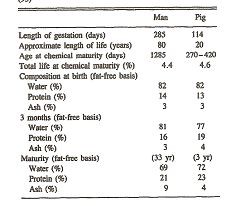Si osserva innanzitutto come lo sviluppo che caratterizza il maiale dalle fasi giovanili a quelle adulte sono proporzionalmente comparabili allo sviluppo umano. Infatti se il maiale raggiunge la maturità nello spazio del 4,4% dell’intera vita, l’uomo la raggiunge nel 4,6%.